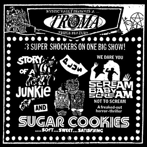 Troma Triple Feature Soundtrack 2lp featuring the Film Scores from Story of a Junkie (1985), Sugar Cookies (1973), and Scream Baby Scream (1969)